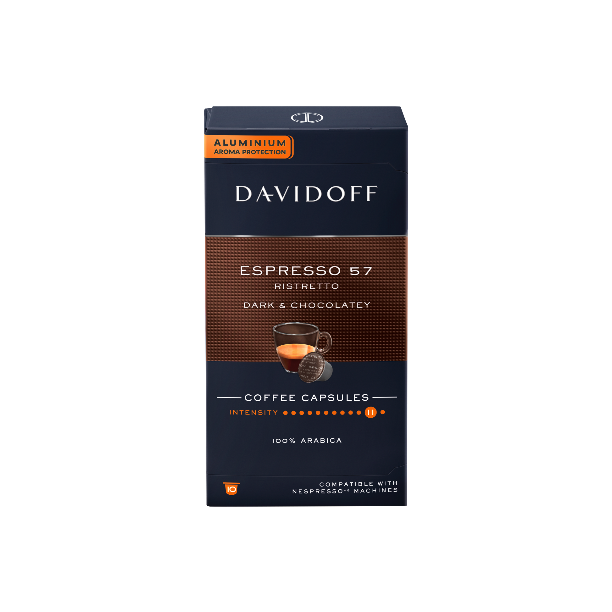 The secret of Davidoff Espresso 57 capsules lies in the fine balance between roasting time and temperature, giving this Espresso its special dark roast and distinctive chocolatey notes. Davidoff Espresso 57 pleases your senses with multi-layered aromas and an intense taste, which are perfect for Ristretto.