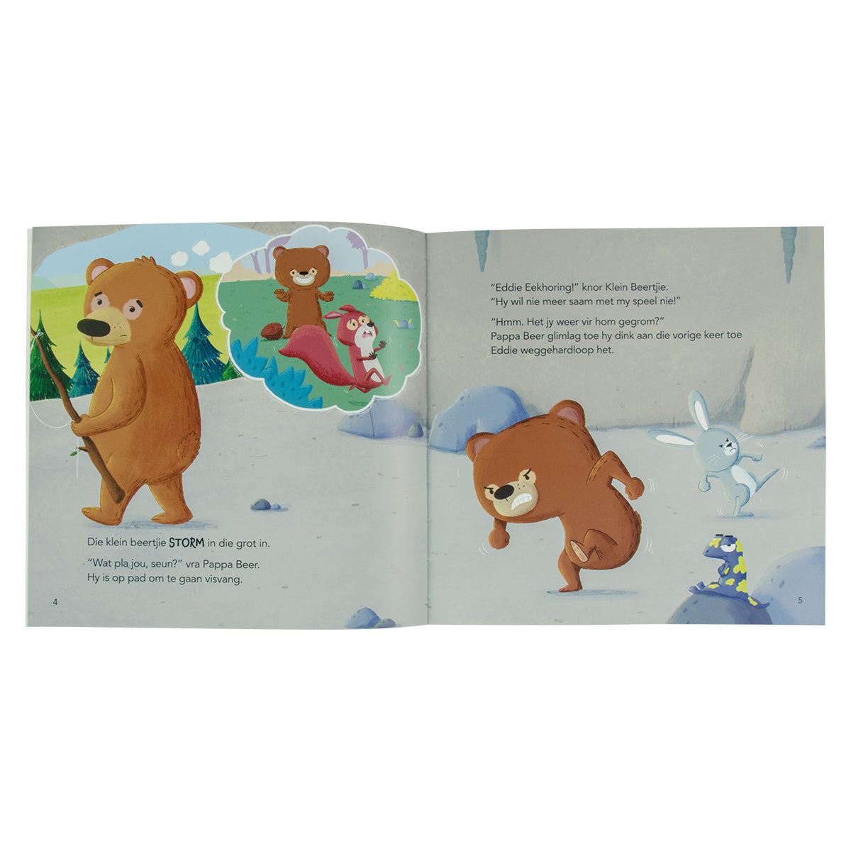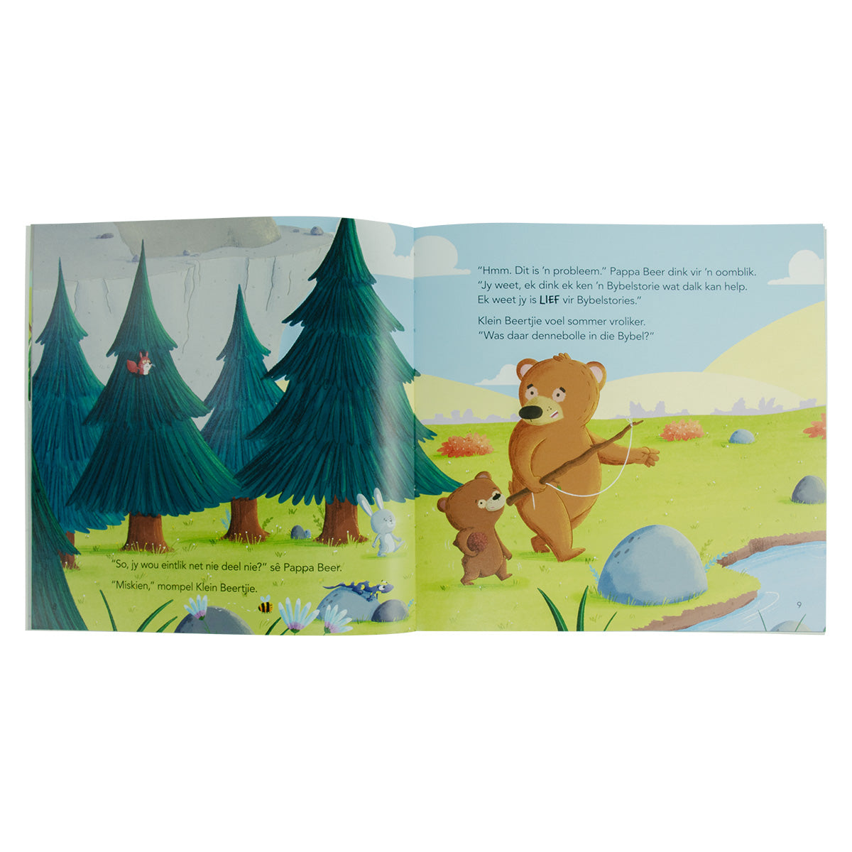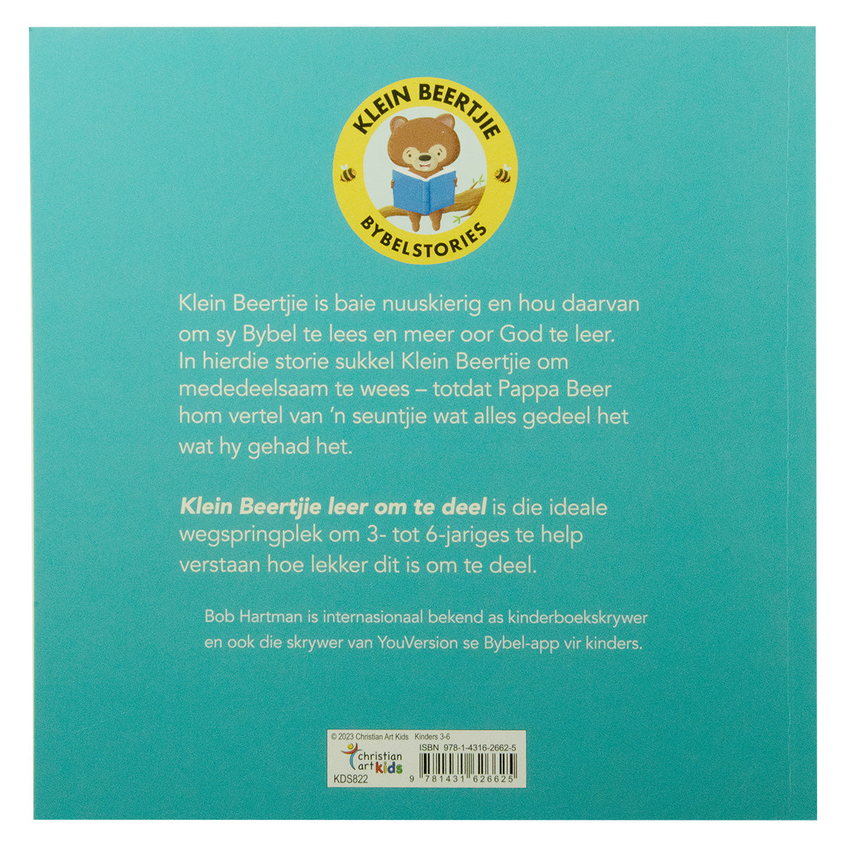 In Klein Beertjie leer om te deel wil Klein Beertjie nie sy dennebol met Eddie Eekhoring deel nie. Dit is totdat Pappa Beer vir hom vertel van ’n seuntjie in die Bybel wat sy middagete van vyf broodjies en twee vissies met Jesus gedeel het. Jesus het dié kos toe gebruik om vir 5 000 mense kos te gee!
