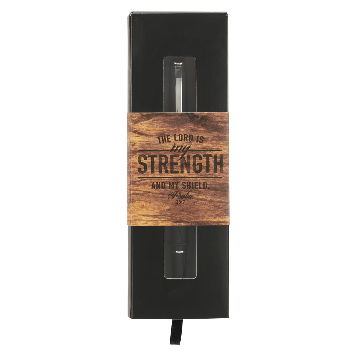 The handsome pen comes packaged in a gift box with a slide-out tray and black ribbon pull. The box is o-wrapped with a label featuring a woodgrain background and the verse pictured as a typographical design.