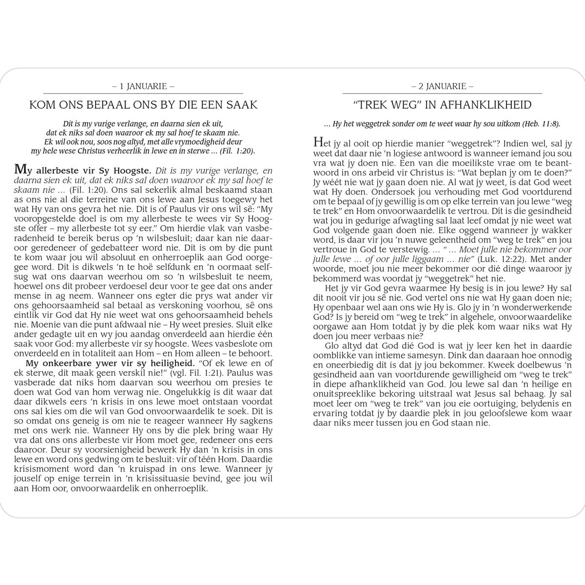 Hierdie pragtige uitgawe is baie meer as ’n geskenk vir ’n spesiale geleentheid – dit is ’n uitnodiging om jou geloof te verdiep. Sedert die eerste verskyning van die Engelse uitgawe in 1934 is miljoene eksemplare wêreldwyd verkoop, en dit word gesien as een van die gewildste Christelike boeke wat ooit geskryf is. Prikkelende, lewensveranderende oordenkings wat nie lank neem om te lees nie, maar jou hart vul met die tydlose waarhede van die Woord.