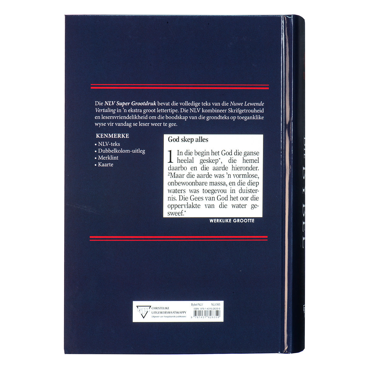 Die Super Grootdruk-uitgawe bevat die volledige teks van die vertroude Nuwe Lewende Vertaling. Dit kombineer Skrifgetrouheid en lesersvriendelikheid om die boodskap van die grondteks in eietydse Afrikaans vir vandag se leser weer te gee. Agt volkleur-kaarte is ook ingesluit.